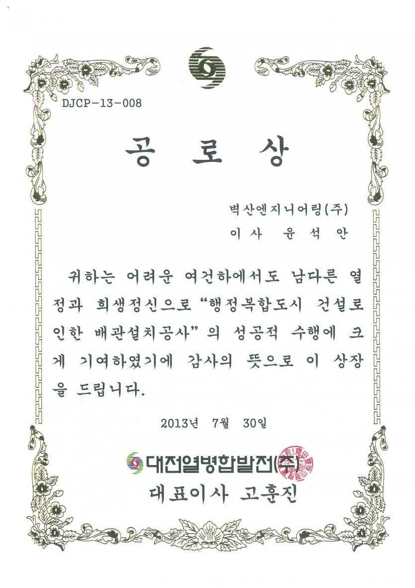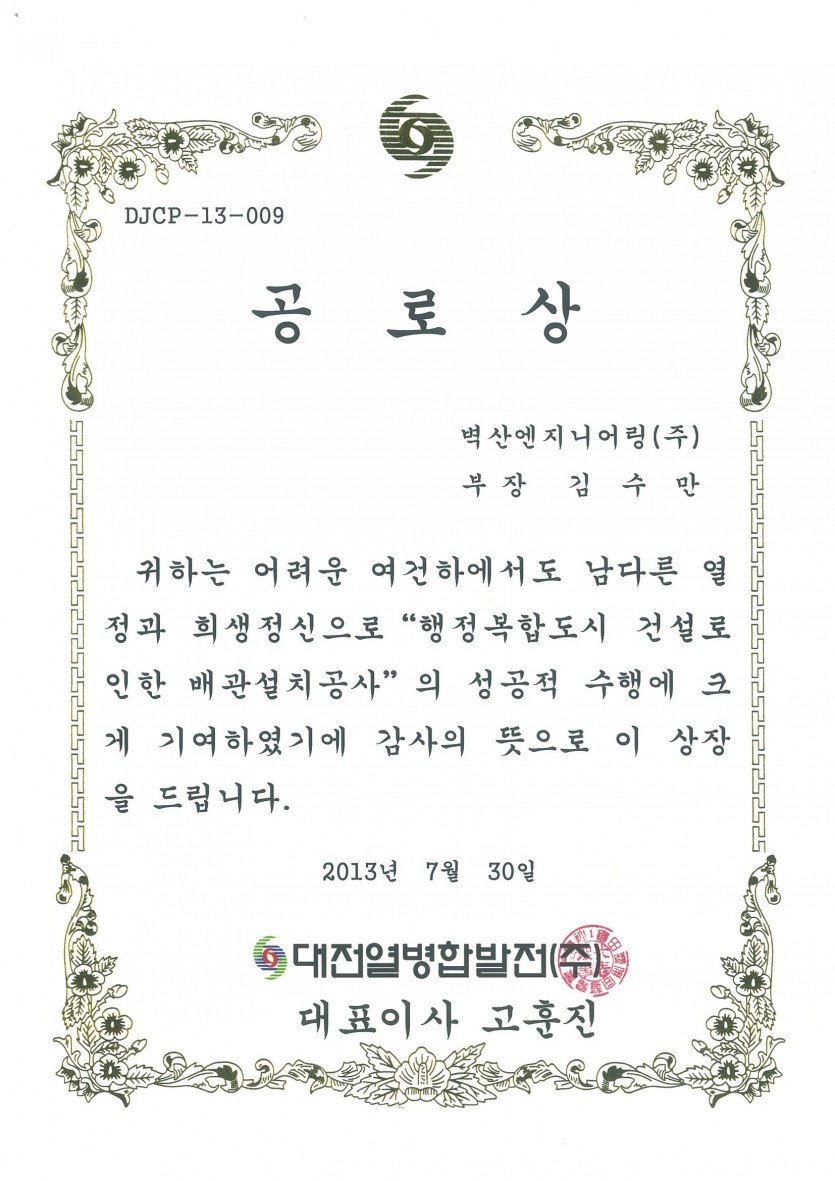 대전열병합발전(주)은 행정복합도시 건설로 인한 배관설치 공사를 성공적으로 수행한 벽산엔지니어링의 윤석안 이사와 김수만 부장에게 공로상을 수여했습니다. 벽산엔지니어링은 언제나 고객만족을 최우선으로 열심을 다하겠습니다.